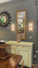 Buffet from France in the Directoire style. This piece is made of solid wood construction that has been finished with a milk paint in the pistachio green color. There is gold leaf trim and brass detailing throughout. There are two dovetailed drawers above two doors that open to interior shelving. This piece is in very nice antique condition – the photos accurately depict the condition.