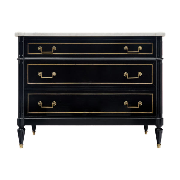 French Louis XV style chest with rouge royal marble top and serpentine shape. This piece features rosewood and tinted rosewood in a floral marquetry throughout. The rogue royal marble top has beautiful color and veining. The finely cast gilt bronze hardware is original to the piece as well.