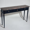 Console table from France in the Louis XVI style. This piece is made of solid wood construction, primarily mahogany. It is ebonized and has been finished with a lustrous French polish of museum quality. There are three dovetailed drawers, each with a gilt brass pull. There are long tapered legs with brass detailing and feet. The top of the table features a “Breche d’ Alep” marble slab. This piece is in very nice antique condition with only minor surface wear consistent with age and use. The photos accurately depict the condition.