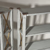 Pair of bookcases from France in the Louis XVI style. They are made of solid wood construction, primarily oak. The pair has been finished with a hand-painted milk paint in a dove gray Trianon color. The sides of each bookcase feature x-shaped stretchers all finished with gold leaf, the pieces feature finely cast bronze caps and gilt bronze feet. Each bookcase has three shelves. They are in very nice antique condition with only minor surface wear consistent with age and use. The photos accurately depict the condition.