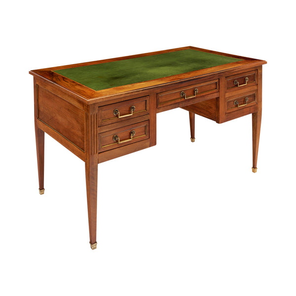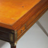 An 18th century Louis XVI period French Mahogany Trictrac table with gilt brass trims throughout. This museum quality piece in the manner of Riesener (Marie Antoinette’s favorite ébéniste) has been fully restored and features two operable drawers and two fixed drawers below a felt lined surface on one side of the removable top and leather on the other. The top lifts to reveal a complete backgammon/trictrac board featuring rare ivory and tinted ivory inlays.