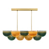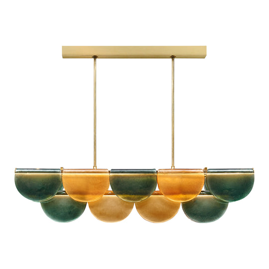 Chandelier from the island of Murano, Italy outside of Venice. This piece features hand-blown and molded glass in amber and forest green tones. The glass curves around the brass structure creating a wave or “onda” design. This piece has been newly wired to fit US standards and is in very nice condition. The photos accurately depict the condition.
