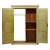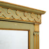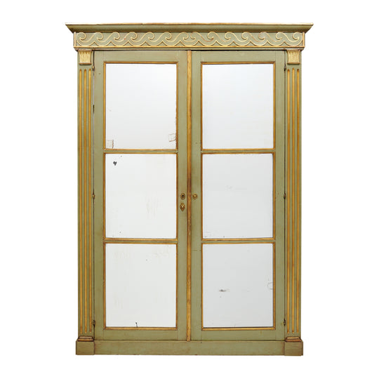 Bookcase from France made of solid wood construction that has been finished with an original green paint. The front of the bookcase is adorned with hand carved columns and a frieze of stylized waves and acanthus leaves in a very pure Etruscan style. The decor is decorated with gold leafing. Two doors are lined with original mercury mirrors. They open to interior wood shelving and have a working lock and key. One side of the interior is open while the other side has wooden shelving. This bookcase is in very nice antique condition – the photos accurately depict the condition. There are two very similar bookcases, this listing is for a single.
