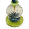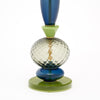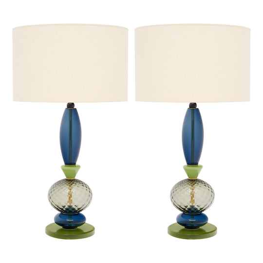 Pair of table lamps made of hand-blown glass elements from Murano, Italy outside of Venice. Each lamp features unique glass components in green and blue tones on a brass structure. We love the geometric forms and bold tones this pair brings to a space. The glass showcases alternating Murano glass techniques including opaque and transparent colors. This one-of-a-kind pair has been newly wired to fit US standards. They are in excellent condition – the photos accurately depict the condition.