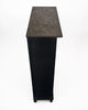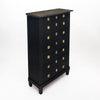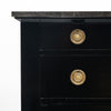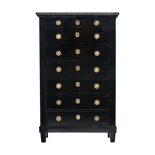French antique semainier in the Directoire style. This piece is made of solid wood construction, primarily mahogany that has been fully ebonized and finished with a lustrous French polish of museum-quality. There are seven dovetailed drawers representing the seven days of the week that give this piece its name – in French “semaine” means week. The drawers all feature two gilt brass pulls and escutcheon. There is a gray Sainte Anne marble slab top original to the piece. It is in very nice antique condition – the photos accurately depict the condition.