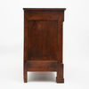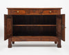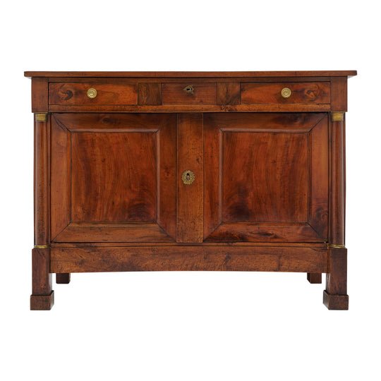 Buffet from France from the empire period. This piece is made of solid wood construction, primarily walnut. There are two half columns with bronze detailing at the top and bottom. There are three dovetailed drawers at the top, all with brass hardware. The center drawer has brass hardware and a key. The two doors open to reveal interior wooden shelving. This piece is in very nice antique condition – the photos accurately depict the condition.