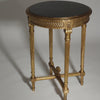 Side table or gueridon from France made of solid wood construction that features a gold-leafed finish and a black painted top mimicking marble. Hand carving can be found throughout and adds a neoclassic; feminine touch. We love the acorn motif found in the carved central finial. This piece is in excellent antique condition with only minor surface wear consistent with age and use. The photos accurately depict the condition.