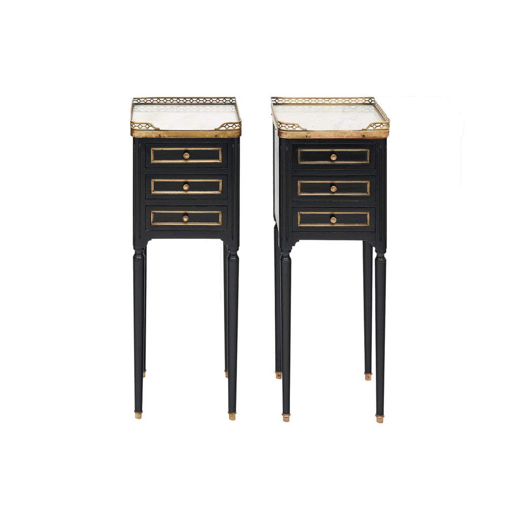 Set of two side tables in the Louis XVI style from France. This set is ebonized and finished with a lustrous French polish of museum quality. Each table has three dovetailed drawers and is topped with Carrara marble surrounded by a brass gallery. Each finely dovetailed drawer is trimmed with brass and features a brass knob. Each table is supported by tall, tapered legs with brass feet. They are in excellent antique condition – the photos accurately depict the condition.