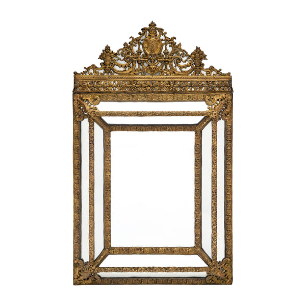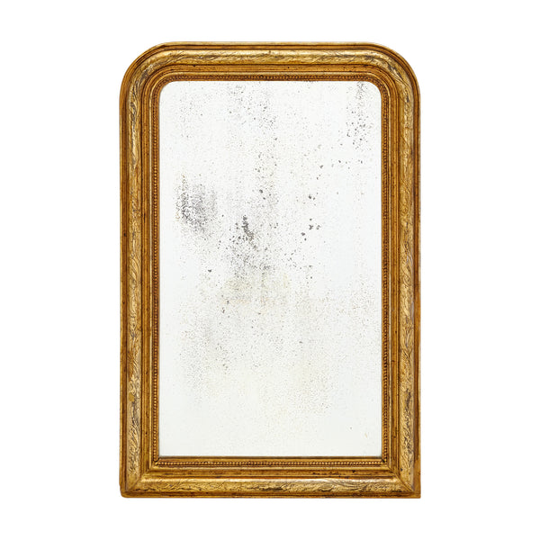 Antique French mirror made with a hand carved Regency style wood frame. The finish and paint is all original. We love the patina and original mercury mirror.