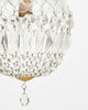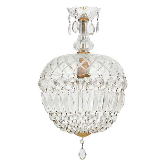 Chandelier/pendant from France in the iconic Baccarat bell shape. The crystal fixture top holds strands of cut crystal elements (cabochons) that come together with a delicate crystal finial. This piece has been newly wired to fit US standards. It is in very good antique condition – the photos accurately depict the condition.