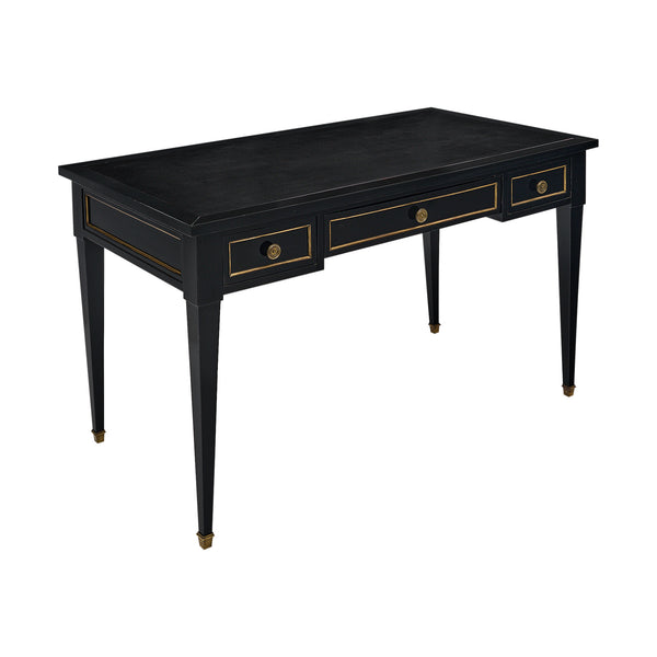 Desk, French, in the Louis XVI style made of ebonized Mahogany that has been finished in a lustrous museum quality French polish. This work table boasts a gilt embossed brown leather top and four dovetailed drawers. The original hardware and gilt brass trims can be found throughout. It is supported by fluted and tapered legs. There is one pull out leaf that adds an additional 15” to the length.