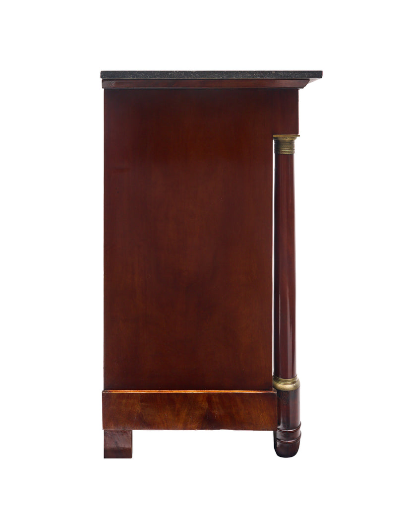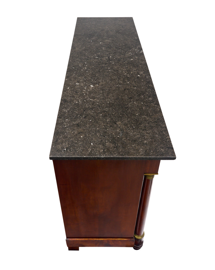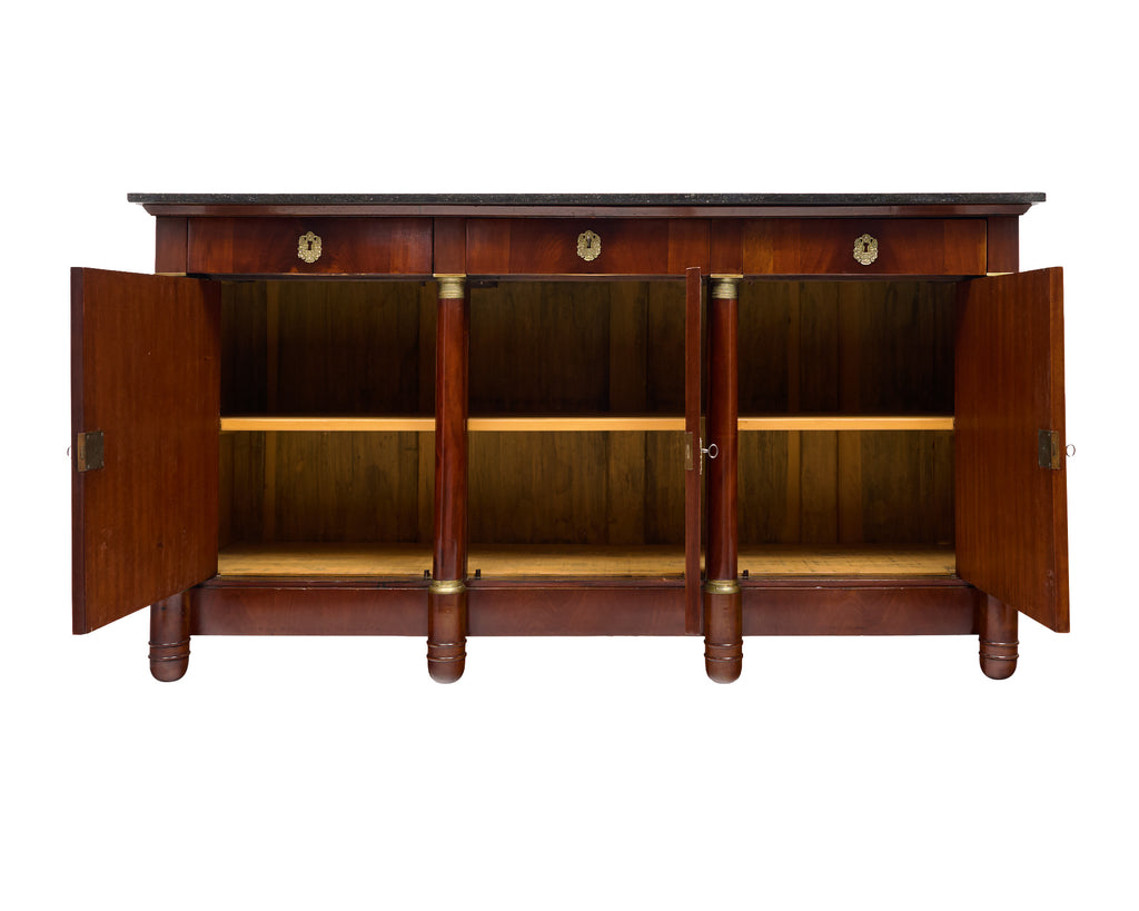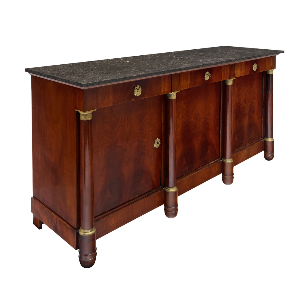 Empire style French antique buffet made of solid wood construction, primarily Cuban flamed mahogany. This piece has been finished with a lustrous French polish of museum quality. Four columns give prominence to the piece. The doors open to interior wood shelving and are topped with three dovetailed drawers. The columns, doors, and drawers all feature gilt bronze hardware and décor. The strong credenza is highlighted by an intact dark gray Sainte Anne marble slab. This piece is in very nice antique condition with only minor surface wear consistent with age and use. The photos accurately depict the condition.