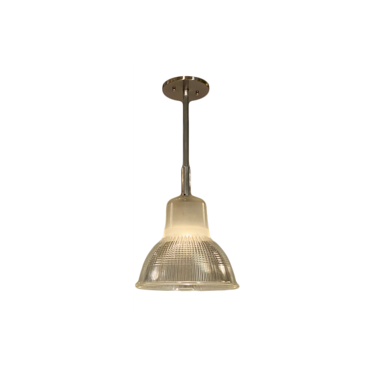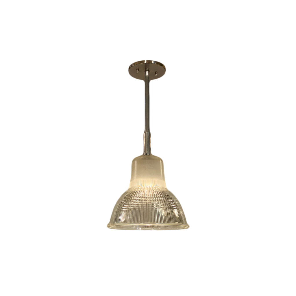 A unique single French industrial pendant light of glass and aluminum. They have been newly wired to fit US standards.