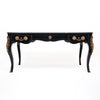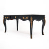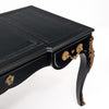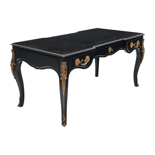 French antique Louis XV style bureau plat desk made of solid wood construction that has been ebonized and finished with a lustrous French polish finish of museum-quality. The desk has the original black leather top. There are three dovetailed drawers all richly adorned with gilt bronze hardware . The cabriole legs are also adorned with gilt bronzes. This piece is in very nice antique condition with only minor surface wear consistent with age and use. The photos accurately depict the condition.