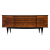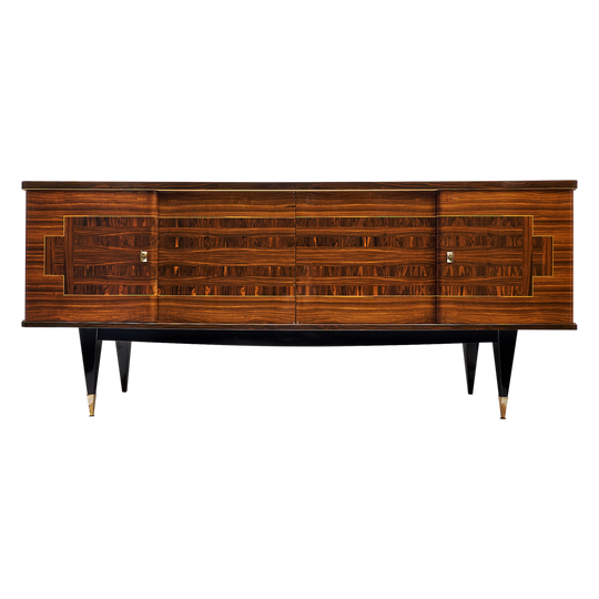French buffet, enfilade, of rosewood and ebony of Macassar. We loved the Intricate Parquetry on the façade of this spectacular credenza. The four doors open up to a satin wood interior with shelves and drawers. Tapered legs with brass feet and with working locks and keys. This sideboard is in very nice vintage condition with only minor surface wear consistent with age and use. The photos accurately depict the condition.
