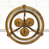 Pair of lanterns of cast bronze structures and curved glass panes. The fixtures feature three candelabras each and stylized acanthus décor. They have been newly wired to fit US standards.