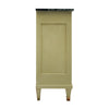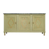 Buffet from France made of solid cherry wood construction. This piece has three doors that open to interior shelving. The doors all feature brass hardware and keys. This piece is finished with a traditional paint in a pistachio green tone. The doors are adorned with gold leafed diamond embellishment. The buffet is topped with a dark green “pietra verde“ marble slab. It is in very nice antique condition – the photos accurately depict the condition.