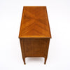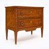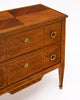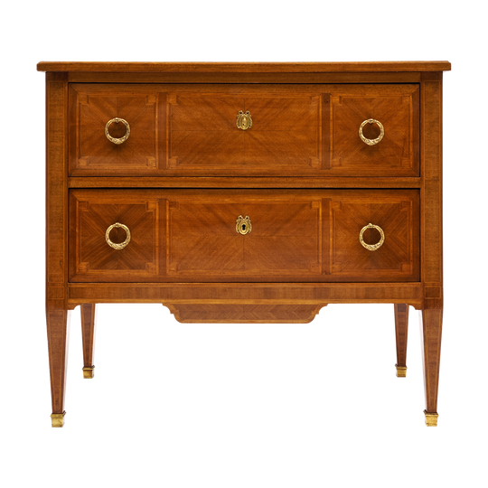 Chest/ commode in the Louis XVI style. Made of marqueted and inlayed rosewood. The piece features two dovetailed drawers with their original finely cast bronze hardware. Locks and key are original and in working condition. The piece is in very nice antique condition with only minor surface wear consistent with age and use. The photos accurately depict the condition.