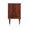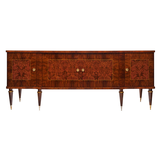 Grand buffet enfilade from France circa 1960. This important credenza features a combination of burled ash and figured Elm on its façade, doors, and top. The legs are tapered with brass feet. All locks and keys are original. The lemon wood interior offers ample storage with shelves and drawers.