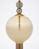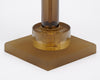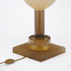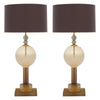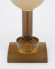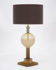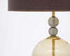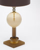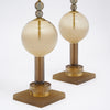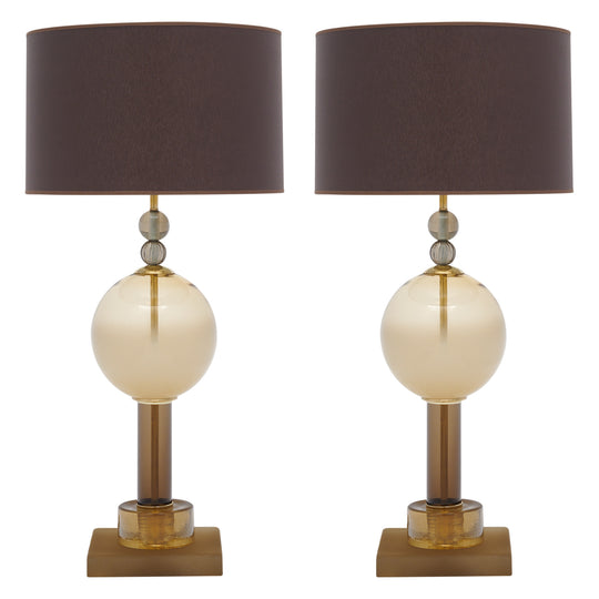 Pair of hand-blown Murano glass lamps featuring unique glass components on a brass structure. In the style of iconic Italian designer Ettore Sotsass. We love the geometric forms and strong impact this pair brings to a space. We love the contrast of the frosted globe with the smoked and gray glass elements. They have custom chocolate colored shades. This pair has been newly wired to fit US standards.