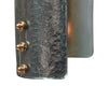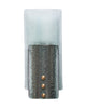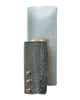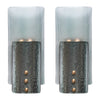 Pair of sconces made of Murano glass in a striking “bleu pétrole” color. This pair is crafted of molded glass from the island of Murano outside of Venice, Italy. There are two glass components to the sconces - the bottom layer is a light blue frosted glass, while the top layer has a metallic effect. The glass is supported on a metal structure with brass finials. The sconces have been newly wired to fit US standards.