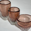Set of Murano glass vases from the island of Murano outside of Venice, Italy. The set of three is hand-blown in a beautiful mauve color. Each showcases several striking glass techniques. While the glass is still in fusion, each vase was rolled in molten fragments of glass creating this striking effect of frozen or iced glass.