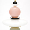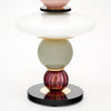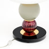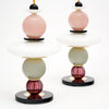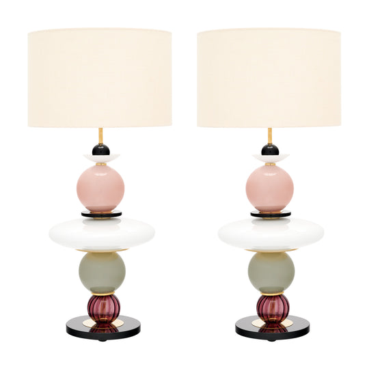Pair of table lamps made of hand-blown glass elements from Murano, Italy outside of Venice. Each lamp features unique glass components in pink, black and white tones on a brass structure. We love the geometric forms and bold tones this pair brings to a space. The glass showcases alternating Murano techniques including opaque and transparent colors. This one-of-a-kind pair has been newly wired to fit US standards. They are in very nice condition – the photos accurately depict the condition.