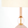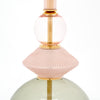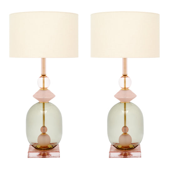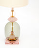 Pair of table lamps made of hand-blown glass elements from Murano, Italy outside of Venice. Each lamp features unique glass components in pink tones on a brass structure. We love the geometric forms and lovely color this pair brings to a space. The glass showcases alternating Murano techniques including opaque and transparent colors. This one-of-a-kind pair has been newly wired to fit US standards. They are in very nice condition – the photos accurately depict the condition.