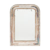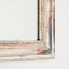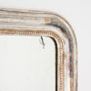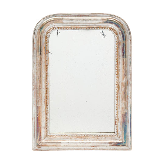 Mirror from the Louis Philippe period in France. This mirror features the original mercury mirror within the classic Louis Philippe molded frame with curved upper corners. The frame is made of solid wood hand carved and stuccoed. This mirror boasts carved detailing and pearling. There is an undertone of sienna glaze covered with a patinated silver leafing. It is in excellent antique condition – the photos accurately depict the condition.