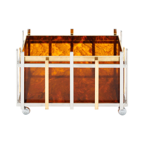 Planter from the Modernist period in Italy. This piece has a chrome structure with original chrome caster wheels in working condition. Brown tortoiseshell colored plexiglass fits within the chrome structure. This piece is in very nice vintage condition with only minor surface wear consistent with age and use. The photos...