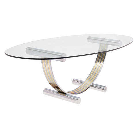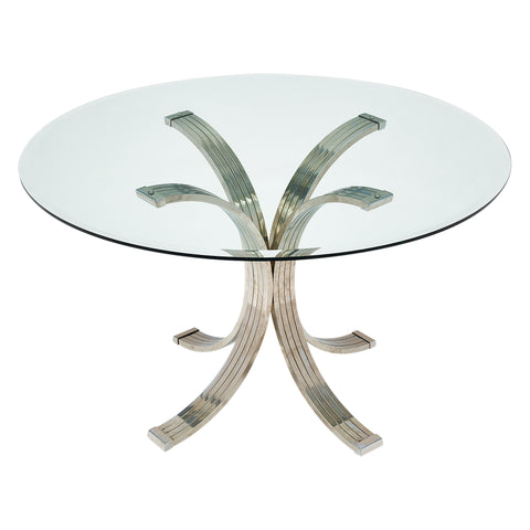 Round table, from Italy, attributed to the iconic designer Romeo Rega. This table boasts a glass top with with bevel and a base featuring four arched components of brass and chromed steel.