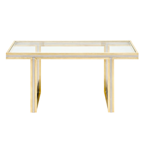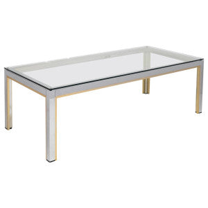 Italian vintage coffee table in chrome and brass with a glass top, in the manner of Romeo Rega. We love the elegant combination of the metals in a clean, mid-century design.
